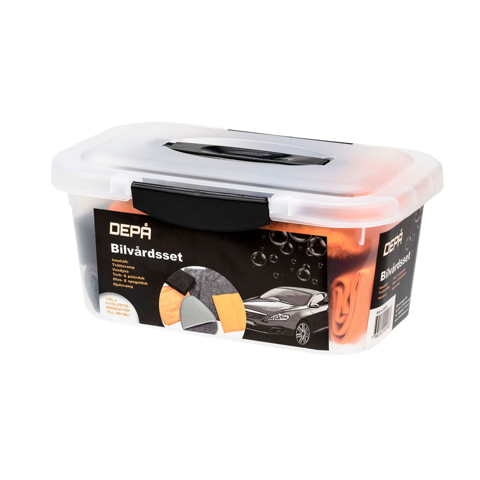 Bilvårdsset 5 delar. Innehåll: tvättsvamp, vaxdyna, tork- & polerduk, glas & spegelduk och hjulsvamp.